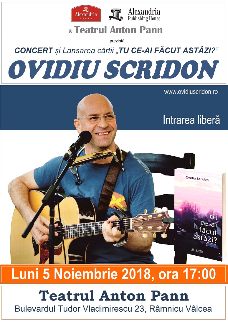 Luni, 5 noiembrie 2018, de la ora 17.00, în foayerul Teatrului Anton Pann cei interesați de muzică și poezie sunt invitați la Concertul de muzică folk și lansarea cărții ce se intitulează ”Tu ce ai făcut astăzi” eveniment ce poartă marca îndrăgitul solist de muzică folk, Ovidiu Scridon. Ovidiu este foarte cunoscut în breasla sa, dar pentru cei care nu-l cunosc încercăm să facem o scurtă biografie.