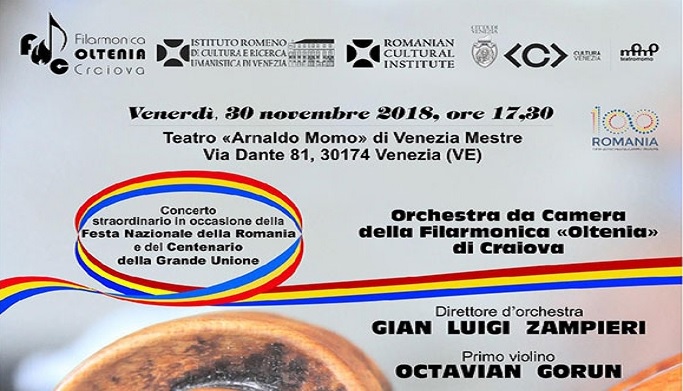 Cu prilejul celebrării Zilei Naţionale a României şi Centenarului Marii Uniri, vineri, 30 noiembrie 2018, la ora 17,30, la Teatrul «Arnaldo Momo» din Venezia Mestre, situat în Via Dante 81, 30172 Venezia (VE), Italia, se desfăşoară concertul extraordinar susţinut de Orchestra de cameră a Filarmonicii «Oltenia» din Craiova. Concertul este organizat de Institutul Român de Cultură şi Cercetare Umanistică de la Veneţia, în colaborare cu Filarmonica «Oltenia» Craiova şi Teatrul «Arnaldo Momo» din Venezia Mestre, cu sprijinul Institutului Cultural Român.