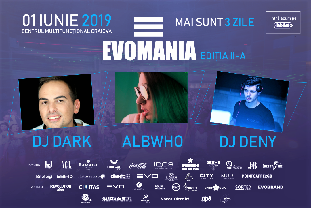 Centrul Multifuncţional Craiova va găzdui, la acest sfârșit de săptămână, un show grandios de muzică electronică, artiști naționali și internaționali, culoare, joc de lumini şi efecte spectaculoase. Craiovenii se vor bucura, sâmbătă, 1 iunie 2019, de cel mai dinamic eveniment muzical al verii în regiunea Oltenia – EVOMANIA 2019, Ediția a-II-a.