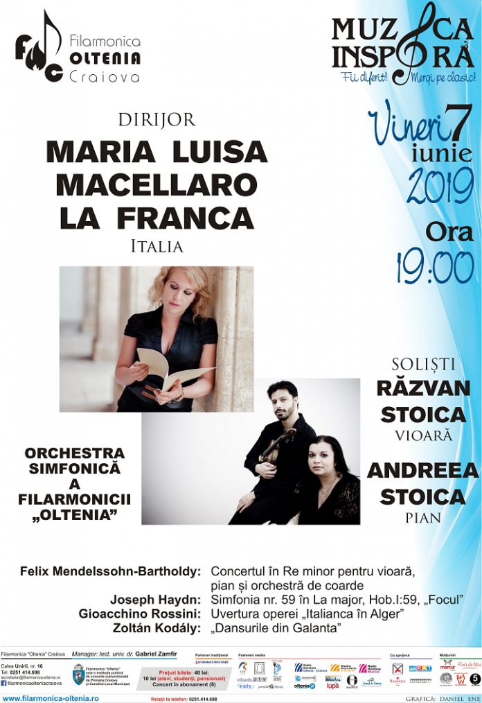 Dirijoarea Maria Luisa Macellaro La Franca (Italia) vine pentru prima dată la Craiova vineri, 7 iunie 2019, ora 19.00, cu un program divers, alături de Răzvan Stoica şi Andreea Stoica. Reputaţii solişti vor interpreta concertul în Re minor pentru vioară şi pian, compus – la doar 14 ani – de Felix Mendelssohn-Bartholdy.