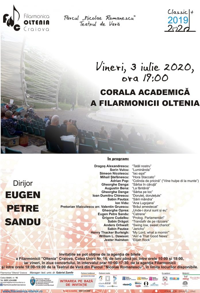 Vineri, 3 iulie 2020, de la ora 19.00, Corala Academică a Filarmonicii „Oltenia” Craiova, dirijată de prof. univ. dr. Eugen Petre Sandu invită iubitorii genului la un concert cu un repertoriu divers, incluzând muzică sacră (bizantină şi gospel) şi prelucrări folclorice. Publicul prezent la Teatrul de Vară din Parcul „Nicolae Romanescu” va asculta lucrări compuse de Dragoş Alexandrescu, Sorin Vulcu, Sabin Pautza, Ion Vidu, Gheorghe Oprea, Eugen Petre Sandu şi Grigore Cudalbu.