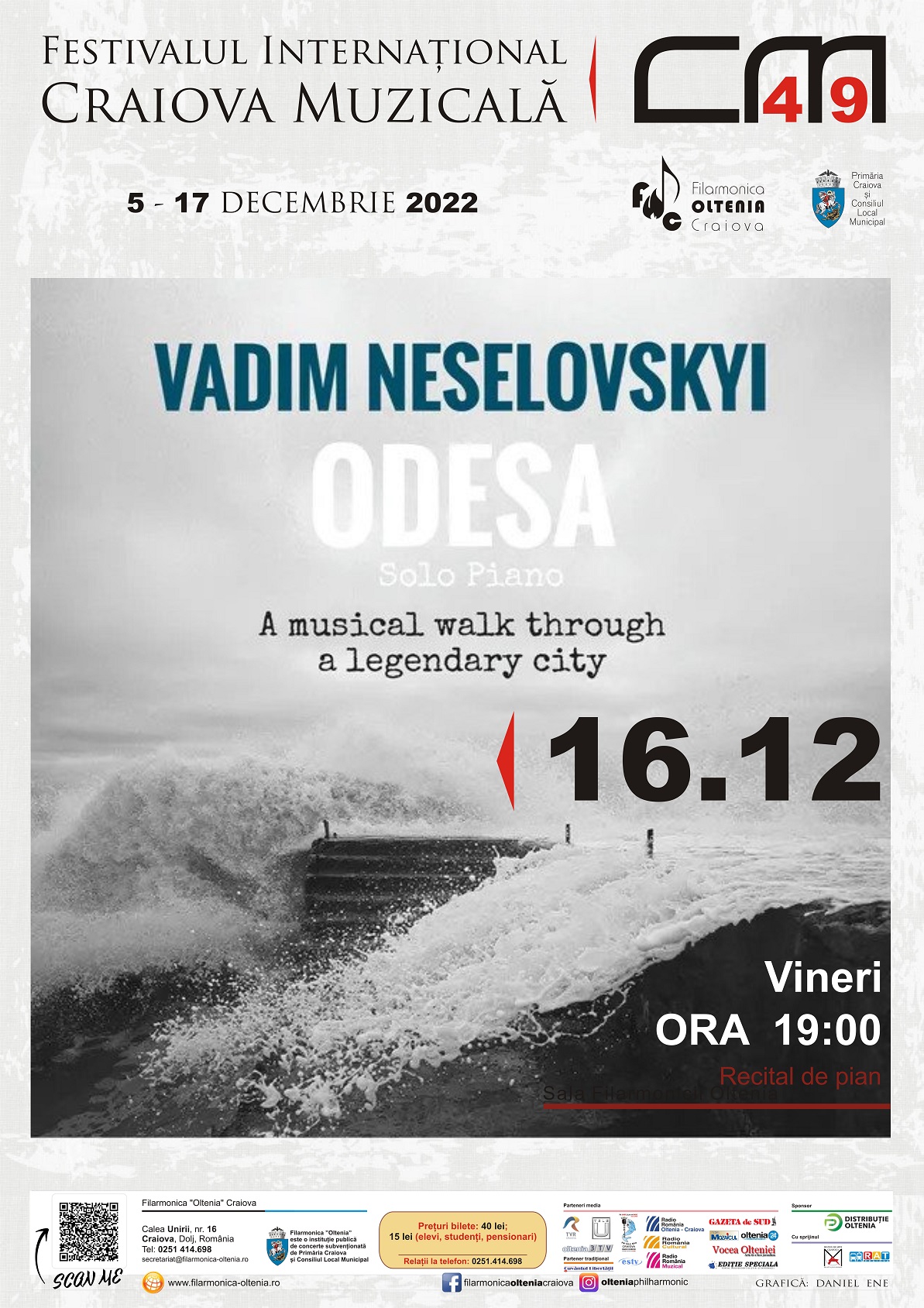 FESTIVALUL INTERNAȚIONAL ”CRAIOVA MUZICALĂ”, ajuns anul acesta la ediția 49, continuă săptămâna viitoare cu încă 5 evenimente muzicale și artiști reputați din UCRAINA, ELVEȚIA și, bineînțeles, din ROMÂNIA. Luni, 12 decembrie, de la ora 19:00, va avea loc concertul MILLENIUM ARTS QUARTET, cu lucrări semnate de Antonio VIVALDI iar VIȚA DE VIE Simfonic și concertul de colinde cu PAULA SELING, din datele de 13 și 14 decembrie, se vor ține cu casa închisă. Vineri, 16 decembrie, ora 19, Suita pentru pian ”Odesa – a musical walk through a legendary city” de VADIM NESELOVSKI din Ucraina va fi cântată chiar de compozitor, încărcătura emoțională fiind una specială, de solidaritate cu toate victimele de război.